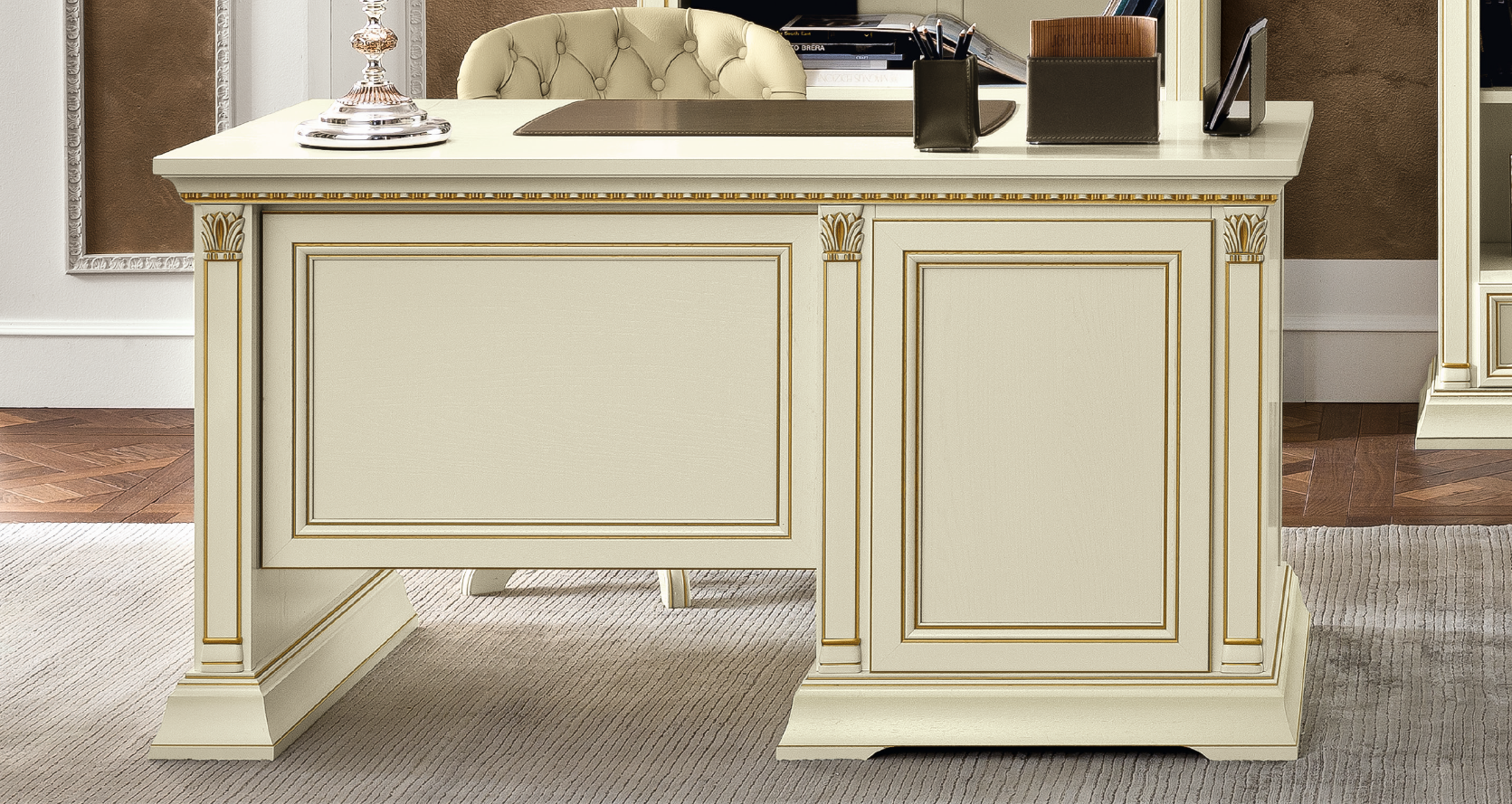Biurko w kolorze kości słoniowej prezentuje się niezwykle atrakcyjnie. Wybarwienie to jednocześnie sprawdza się doskonale w codziennym użytkowaniu. Biurko zostało wykonane solidnie i precyzyjnie. Doskonale odzwierciedla włoskie rzemiosło które kładzie nacisk na dbałość o każdy detal.