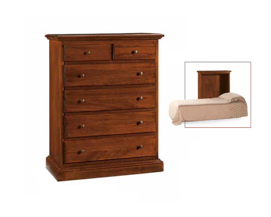 Łóżko zaprojektowano tak, aby wyglądać jak komoda, dzięki czemu jest praktycznym i niewielkim dodatkiem do każdego pomieszczenia. Łóżko chowane jest w całości w skrzyni komody, a fronty szuflad są tylko doskonałym maskowaniem i nie kryją w sobie przestrzeni do przechowywania.