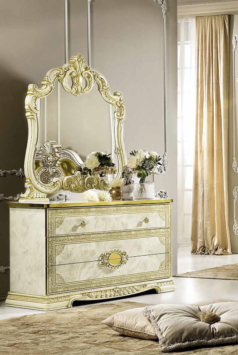 Lustro Leonardo to stylowy element dekoracyjny, który przyciąga uwagę swoją wyjątkową, rzeźbioną ramą ze szlachetnymi złotymi zdobieniami. Klasyczna forma w połączeniu z dopracowanymi detalami nadaje wnętrzu elegancji i luksusowego charakteru. Lustro osadzone jest na solidnych nóżkach, dzięki czemu idealnie sprawdzi się ustawione na komodzie lub bufecie.