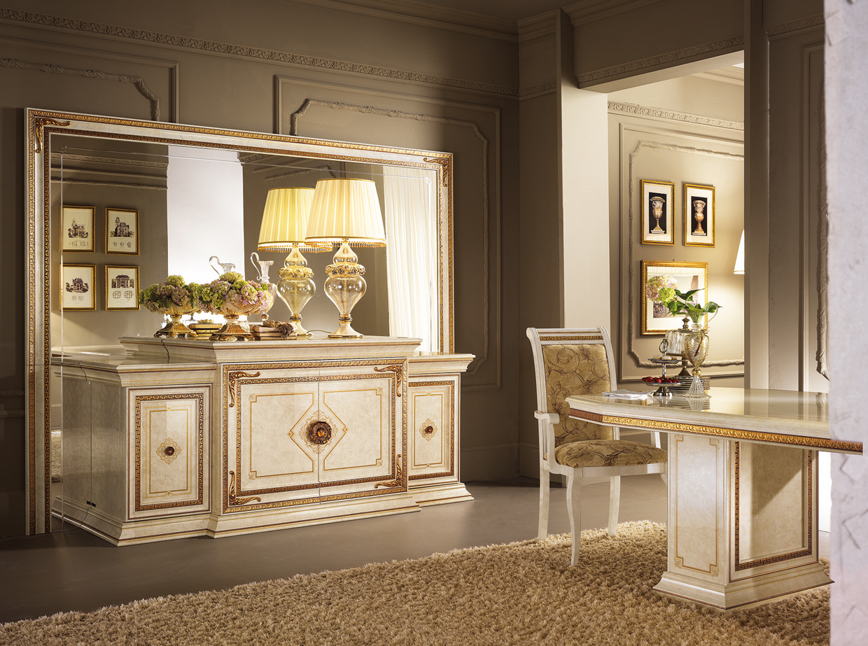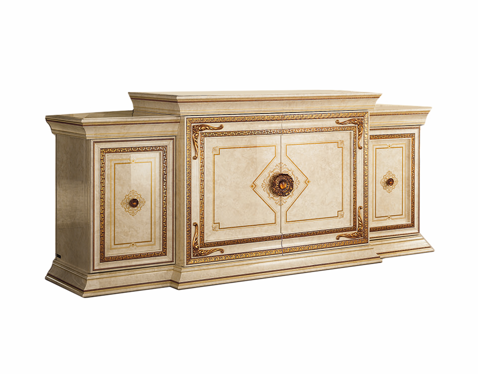 Bufet Arr Leonardo II to luksusowy mebel w kolorze kości słoniowej z bogatymi złoceniami oraz dwoma bocznymi szafkami, które dopełniają całość. Główna część bufetu, wyposażona w dwoje eleganckich drzwi, oferuje obszerną przestrzeń do przechowywania, idealną dla Twojej kolekcji naczyń, sztućców i innych niezbędnych akcesoriów. Dodatkowo, dwie szafki boczne doskonale komponują się z główną częścią, tworząc spójną i harmonijną całość, oraz zapewniają dodatkową funkcjonalność.