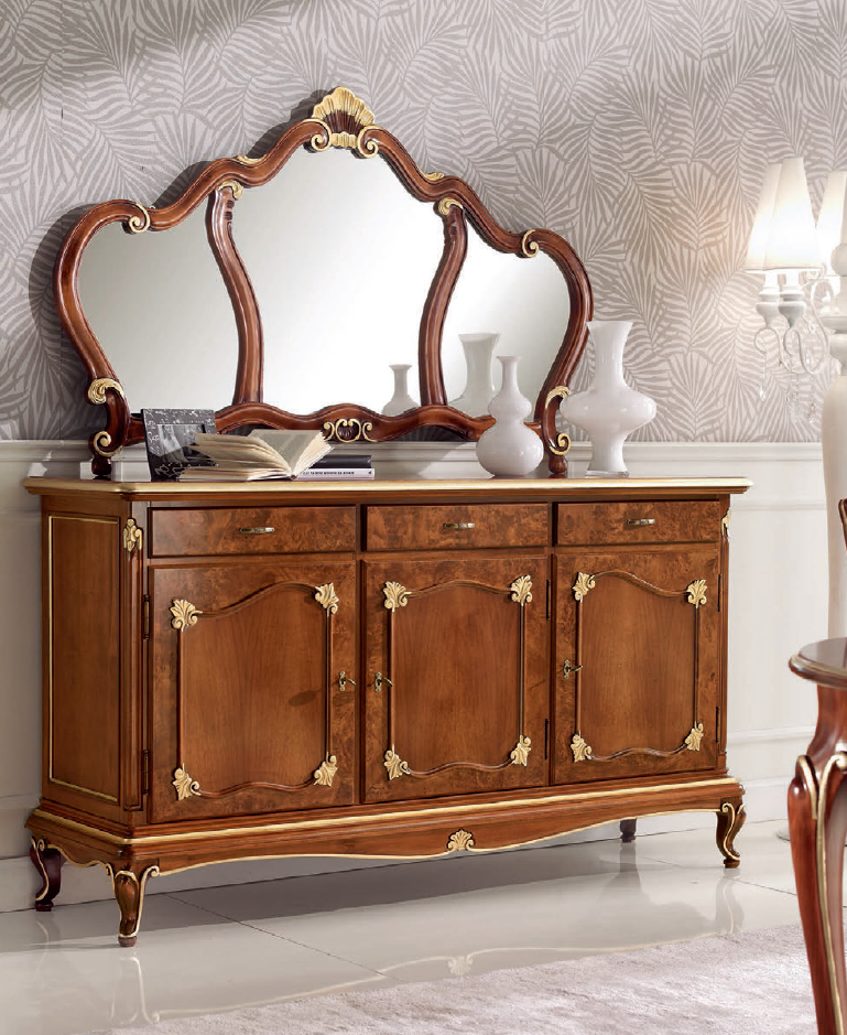 Bufet SE 3012 to elegancki mebel, który łączy klasyczny styl z luksusowymi detalami. Wykonany w wybarwieniu orzechowym, z subtelnymi złotymi akcentami szlagmetalu, bufet wprowadza do wnętrza elegancję i wyrafinowanie. Jego ponadczasowy design sprawia, że doskonale pasuje do salonu, jadalni czy innych przestrzeni, które wymagają stylowego akcentu. Bufet SE 3012 łączy funkcjonalność z estetyką, oferując przestronną przestrzeń do przechowywania, a jednocześnie będąc wyjątkowym elementem dekoracyjnym.