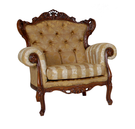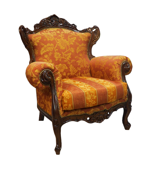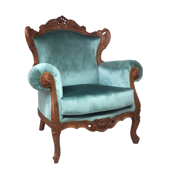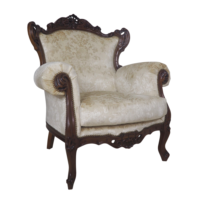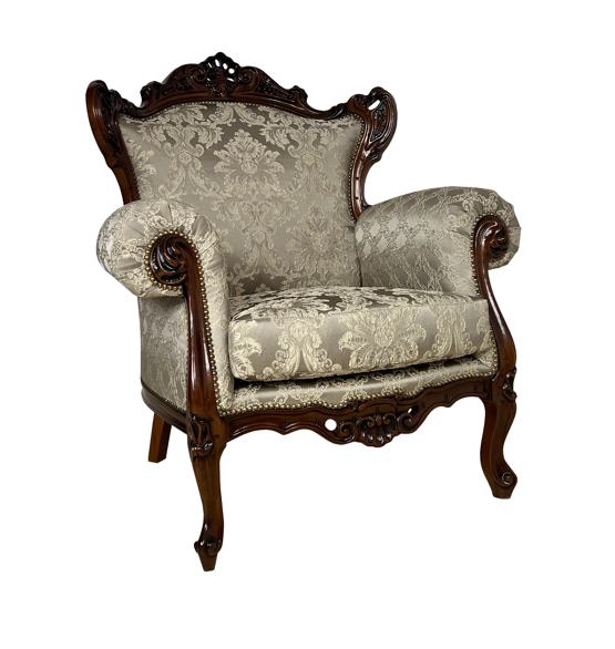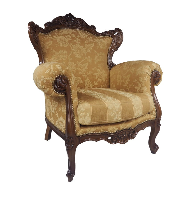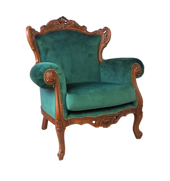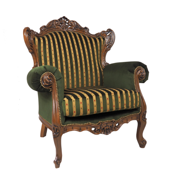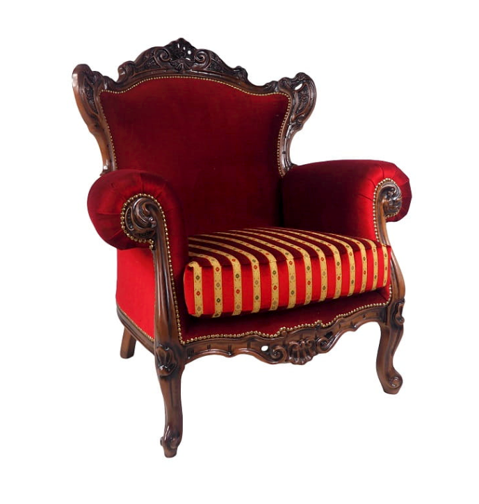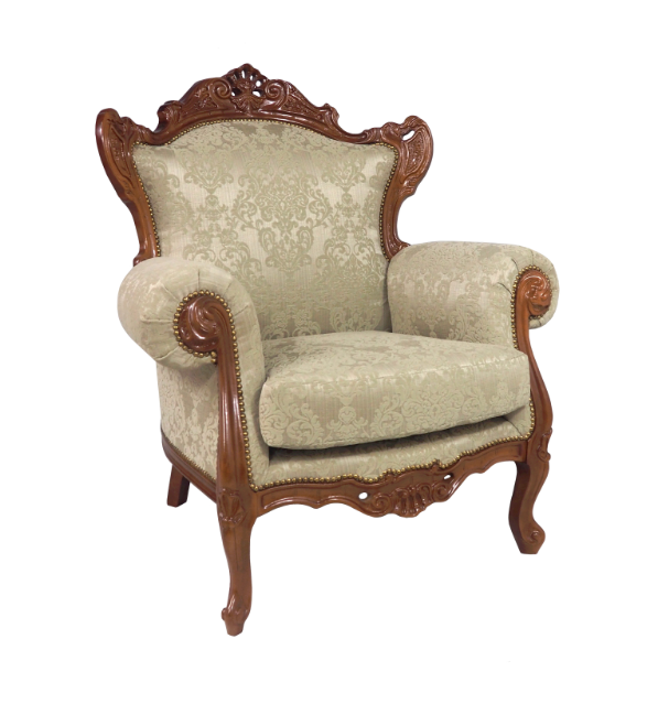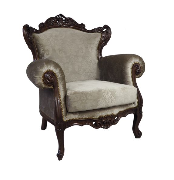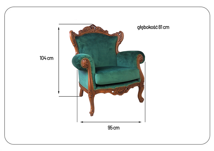Konstrukcja mebla powstała z trwałego litego drewna bukowego. Komfortowe siedzisko oraz miękkie oparcie, zapewniają relaks i wygodną pozycję ciała w trakcie siedzenia. Brzeg oparcia oraz dolna krawędź fotela zostały ozdobione efektownymi rzeźbieniami. Eleganckie nogi dodają meblowi lekkości i podkreślają jego klasyczny charakter. Przy zamówieniu mebla możliwy jest wybór koloru drewna oraz rodzaju tkaniny tapicerskiej.