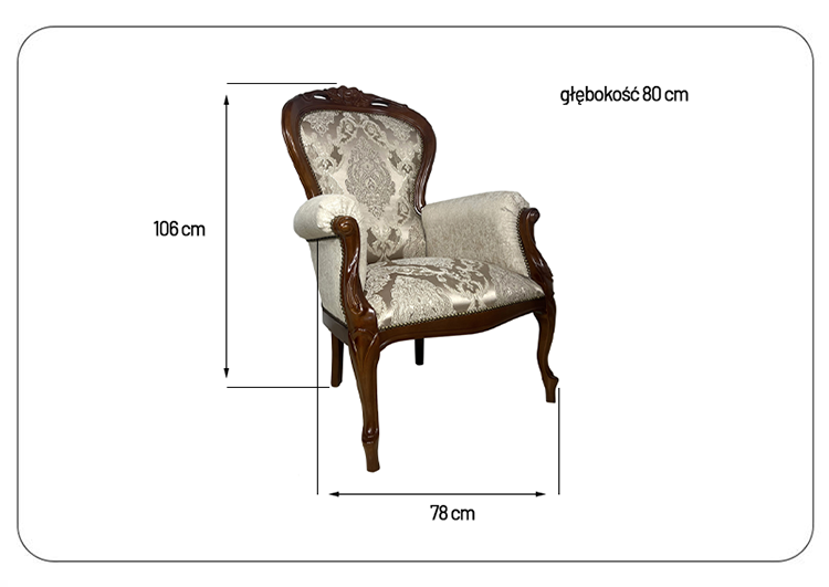 Jego solidna konstrukcja z litego drewna bukowego gwarantuje nie tylko wysoką trwałość, ale także stabilność, co zapewnia długowieczność mebla. Tapicerka fotela została stworzona nowoczesną metodą, która obejmuje gąbkę poliuretanową, pasy tapicerskie, płótno (surówkę) oraz tkaninę dekoracyjną, co zapewnia wyjątkowy komfort siedzenia oraz estetyczny wygląd.