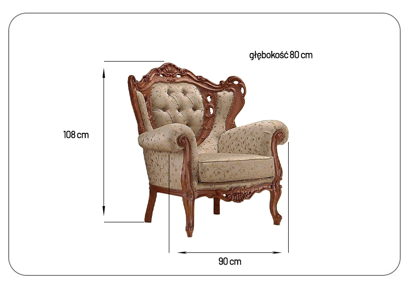 Jego konstrukcja oparta jest na litego drewna bukowego, co gwarantuje trwałość, stabilność oraz wyjątkową jakość. Tapicerka wykonana nowoczesną metodą – z zastosowaniem gąbki poliuretanowej, pasów tapicerskich, płótna (surówki) i wysokiej jakości tkaniny dekoracyjnej – zapewnia wysoki komfort użytkowania oraz atrakcyjny wygląd.