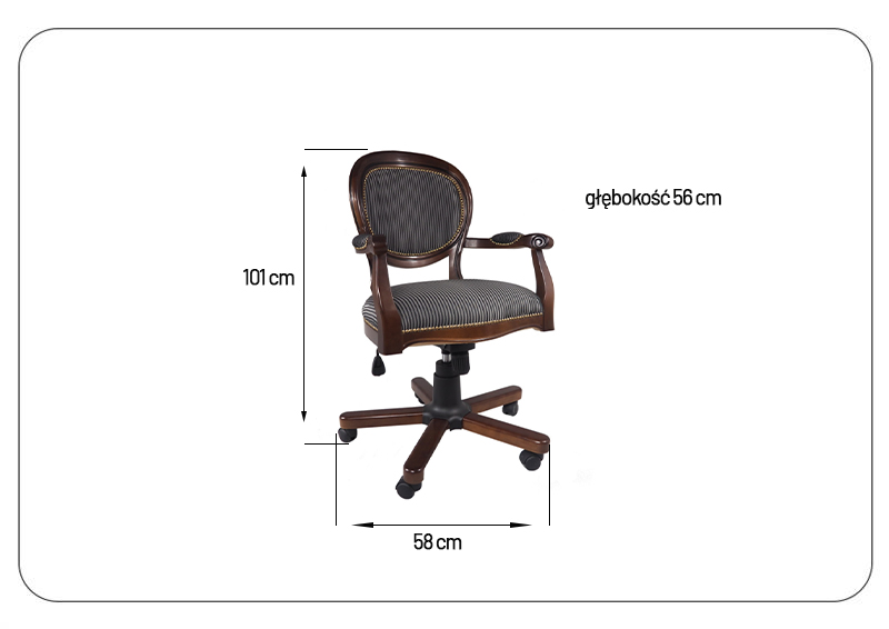 W miejscu łączenia drewna z materiałem zastosowano ozdobne nity. Podstawa włoskiego mebla została zakończona kółkami, które ułatwiają jego przemieszczanie. Kółka i nogę fotela wykonano z wytrzymałego tworzywa. Mebel posiada także regulację wysokości, która pozwala go dopasować do każdego biurka. Fotel obrotowy 20C/KO idealnie nadaje się do eleganckiego gabinetu. Prezentowane zdjęcia mają charakter poglądowy.