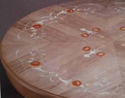*zdobiony intarsją- mozaika ułożona ręcznie z wyciętych elementów drewna.