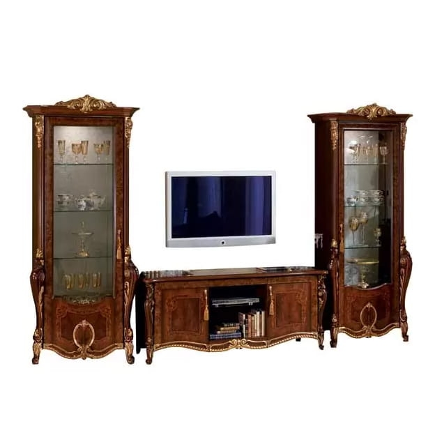 Zestaw z kolekcji Donatello to piękny i imponujący przykład włoskiego wzornictwa. Bogato rzeźbione meble z kolekcji ozdobione są złotymi dekoracjami, tworząc poczucie luksusu i elegancji. Monumentalny kształt elementów zwiększa ich efekt, czyniąc je niezapomnianym i budzącym podziw widokiem. Kolekcja Donatello jest świadectwem umiejętności i kreatywności włoskich rzemieślników. Ciemna tonacja w której utrzymana jest kolekcja dodatkowo wydobywa jeszcze złote zdobienia; z tego i wielu innych powodów meble porównywane są do dzieł sztuki.