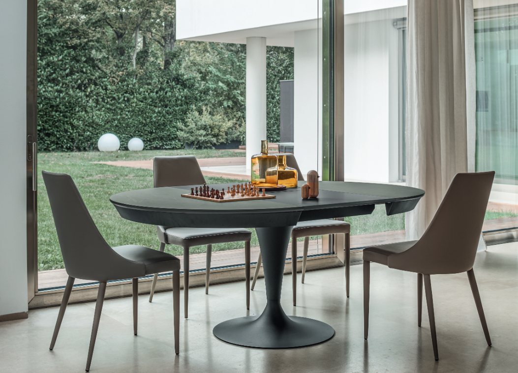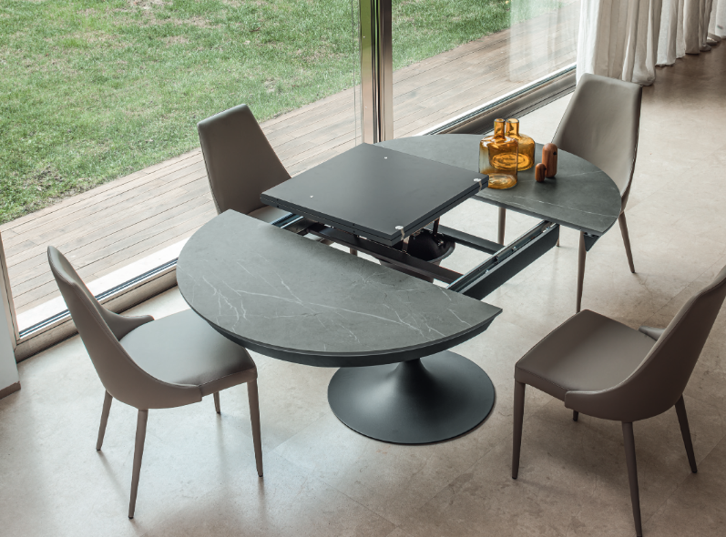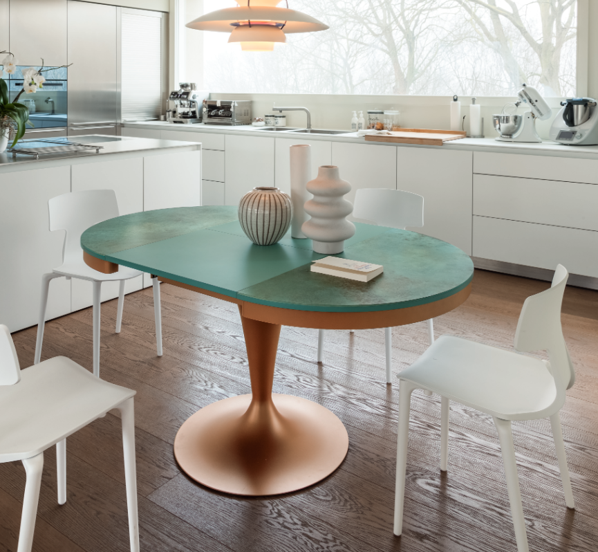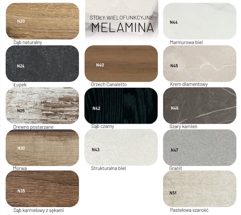 Blat: Wykonany z melaminy, forniru drewnianego (standard oraz w wersji premium - orzech Canaketto) , z efektem betonu lub ceramiki – szeroki wybór materiałów umożliwia dopasowanie stołu do stylu wnętrza.