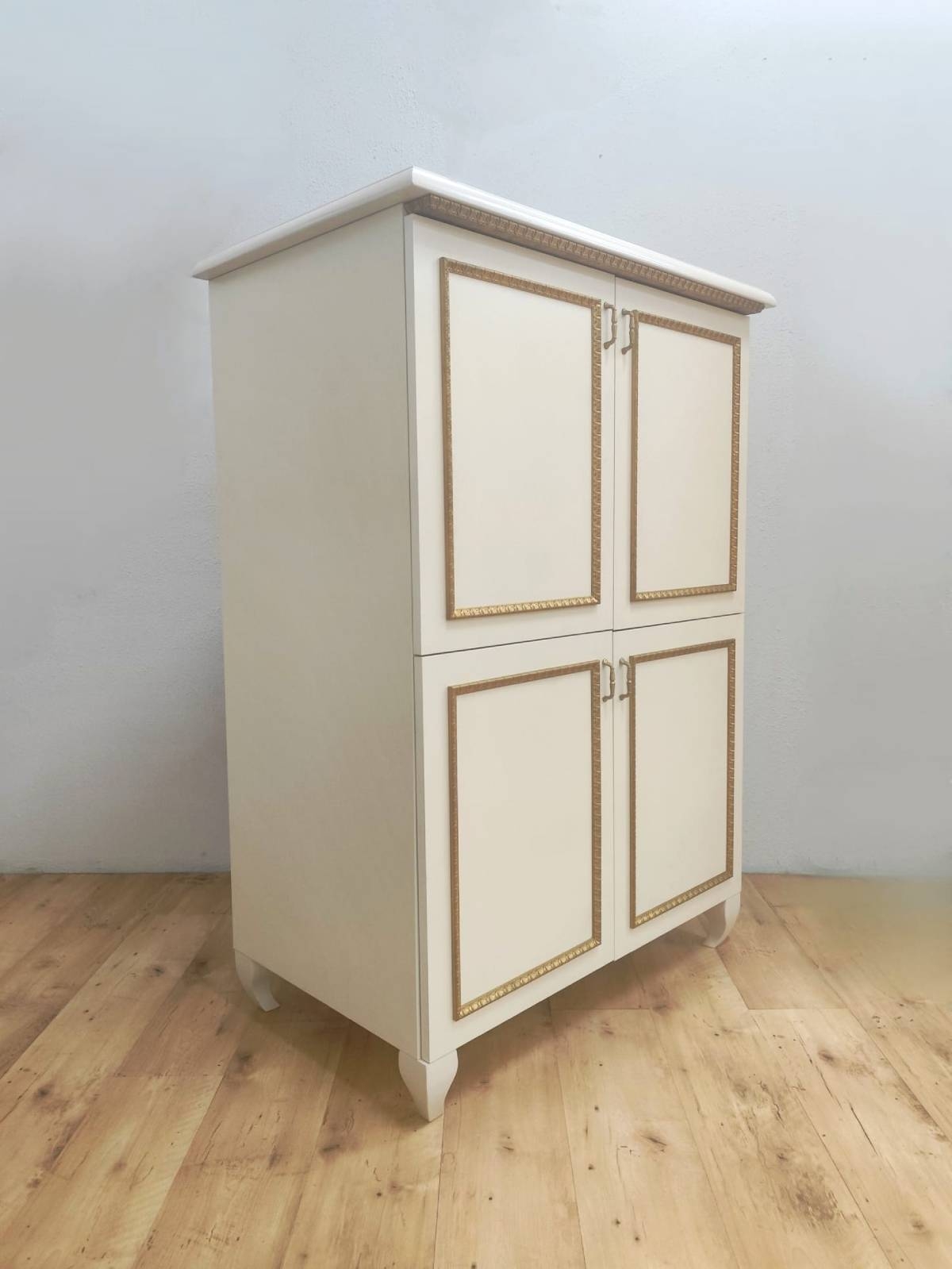 Szafka RTV Venice VE0711 wykonana jest z drewna w kolorze ecru, co nadaje jej subtelności i lekkości. Elementy pokryte złotem dodają meblowi elegancji i wyjątkowego charakteru. To staranne wykonanie i dbałość o szczegóły sprawiają, że szafka prezentuje się wyjątkowo luksusowo i efektownie.